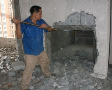 2、拆墻的方案定好了之后,步需要切斷所有電源,關閉天然氣閥門。人工手動拆除應該按照從上到下這張順序,一層一層的進行拆除,不能幾層同時拆除。不能垂直或交叉拆除。拆除面的孔洞需要封閉。當拆除掉一部分之后,應當時間采取加固措施,防止其他部分塌下來。